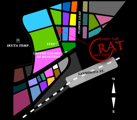 ACT : K106/BLITZ AND SQUASH BRASS BAND/志麿参兄弟/Six Needle Club DJ : サカグチマナブ open18:00/start18:15 TICKET : 前売/当日 ¥2000/¥2500 (入場時別途 ドリンク代 ¥500-) Lコード:57031 (取扱い:6/27 AM10:00〜) ●各線三宮から徒歩2分! 北野坂ど真ん中、靴屋「STEP」を斜め右に入り少し歩くと左手に見える焼肉屋のビルの地下です。入り口がちょっとわかりにくいです。 〒650-0001 神戸市中央区加納町4丁目6-11マスターズビルB1F【Event-hall RAT】 Tel : 078-332-1811 / fax : 078-332-1811 / mail :