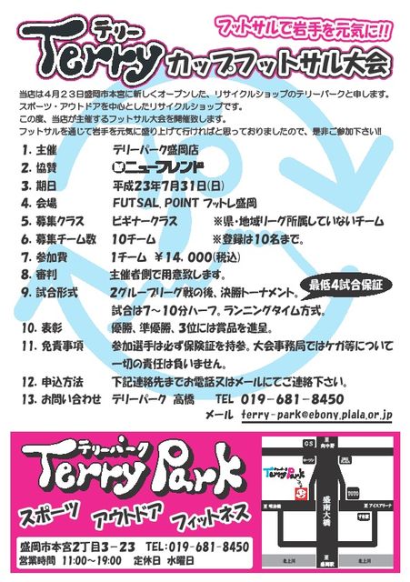 1.主催 テリーパーク盛岡店 2.協賛 ニューフレンド盛岡店 3.期日 平成23年7月31日(日) 4.会場 FUTSAL. POINT フットレ盛岡 5.募集クラス ビギナークラス ※県・地域リーグ所属していないチーム 6.募集チーム数 10チーム ※登録は10名まで。 7.参加費 1チーム 参加費 ¥14,000(税込) 8.審判 主催者側で用意致します。 9.試合形式 2グループリーグ戦の後、決勝トーナメント