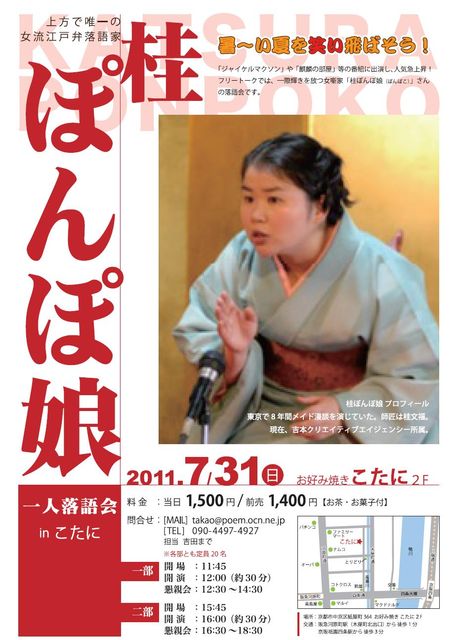 書き込み失礼致します。 7月31日 16:00〜 京都河原町「お好み焼き こたに」にて、桂ぽんぽ娘さんの一人落語会を開催いたします。 お好み焼きこたに http://gourmet.walkerplus.com/164443437001/ (阪急河原町駅徒歩1分、京阪四条駅徒歩3分) ぽんぽ娘さんの落語を1席楽しんで、ご本人と一緒に懇親会をします。 京都観光がてら、御遠方からのお越しも歓迎します。 夏の暑さを笑い飛ばしましょう! ★第二部★ 15:45 開場 16:00〜開演(約30分) 16:30〜18:30 懇親会 料金:1