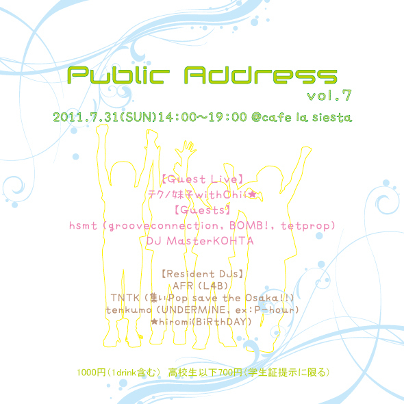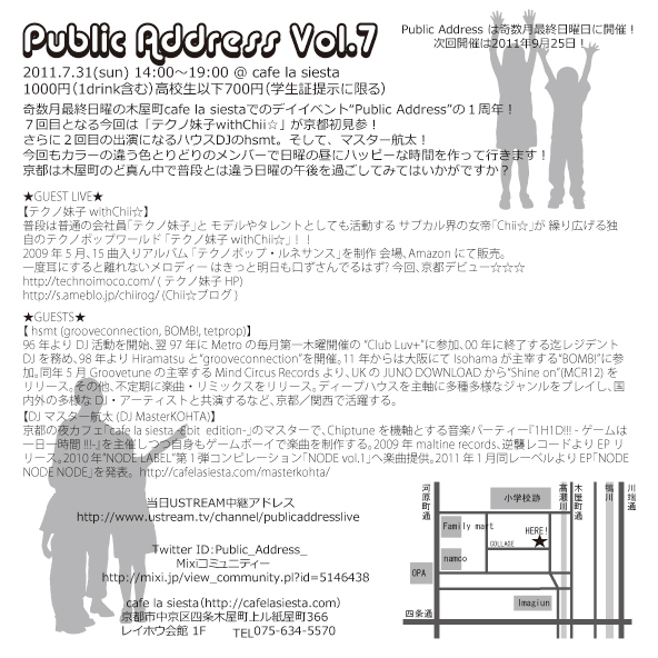 奇数月最終日曜の木屋町cafe la siestaでのデイイベント“Public Address”の1周年! 7回目となる今回は「テクノ妹子withChii☆」が京都初見参!さらに2回目の出演になるハウスDJのhsmt。そして、マスター航太! 今回もカラーの違う色とりどりのメンバーで日曜の昼にハッピーな時間を作って行きます! 京都は木屋町のど真ん中で普段とは違う日曜の午後を過ごしてみてはいかがですか? 【日時】7月31日(日)14:00〜19:00 【場所】cafe la siesta(http://cafelasiesta.com) 【住所】京都市中京区四条木屋町上ル紙屋町366 レイ