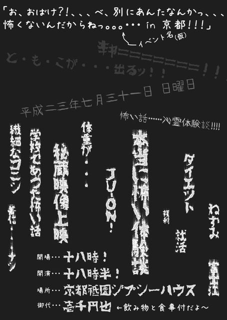 「お、おばけ?!、、、べ、別にあんたなんかっ、、、怖くないんだからねっ。。。in 京都!!!」 開催日→2011年7月31日(日) 時間→OPEN 18:00 START 18:30(※途中参加、終電までの参加OK!!) 場所→京都・祗園「GYPSY HOUSE」 〒605-0073 京都府京都市東山区祇園町北側347-171 タカハシハウジング B1F 料金→1000円ポッキリ!!(しかも美味しい食事と1ドリンク付き!!) 素人の素人による素人による怪談イベント!! クラスのみんなで集まって、修学旅行の夜に怖い話をしちゃうみたいな気軽な感じのイベン