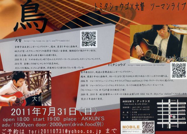 ■7月31日(日曜) 京都:AKKUN'S http://www.akkuns.com/ 前売り1500円 / 当日2000円(1フード1ドリンク別 OPEN 18:00 START 19:00 トミタショウゴ×大督 2マンライブ 「鳥」 (出演)トミタショウゴ / 大督 【コメント】:最近なんかよく一緒にやることが多い 仲がよい??笑 大督君との2マンライブ!! それぞれ1時間ずつ歌います! 普段のライブでは時間の関係上できないような曲や おもしろいこと考えて 盛りだくさんの予定です♪( ´∀`) 前売り予約いただけた方には スペシャルプレゼントも!!