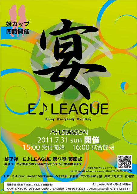E♪リーグに参加されているみなさまお疲れさまです E♪リーグ7thシーズンも全試合が無事終了しました というわけで、いよいよ『宴』の開催が決まりました〜 7thシーズン『宴』 日時:2011年7月31日(日)15:00受付開始 16:00試合開始 場所:KAM'S KYOTO、BALUNA、Alive北大路本店 3人1組のトリオストーナメント (チーム編成はRATによってこちらで振り分けさせて頂きます) 16時より各店舗に別れて予選を行った後、 KAM'S KYOTOにて決勝トーナメントを行います(交通費支給) 同時開催『姫カップ』