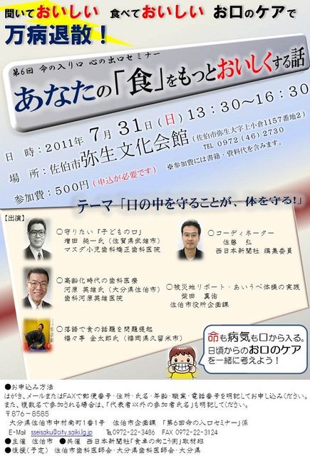 第6回命の入口セミナー開催いたします 【あなたの「食」をもっとおいしくする話】 日時:2011年7月31日(日)13:30〜16:30 場所:佐伯市弥生文化会館 大分県佐伯市弥生大字上小倉1157-2 講師:増田純一先生【マスダ小児歯科矯正歯科医院】(佐賀県武雄市) 河原英雄先生【歯科河原英雄医院】(大分県佐伯市) 福々亭金太郎【食育落語】(福岡県久留米市) 柴田真祐【佐伯市役所企画課】被災地リポート 佐藤弘【西日本新聞社編集委員】コーディネーター 参加費:500円※参加費には書籍・資料代を含みます
