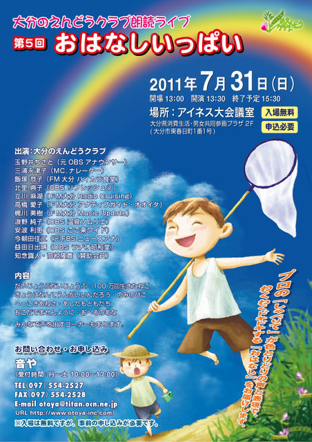 第一線で活躍中のプロの話し手さん達が、読み聞かせをしてくださいます。 2年に1回のこの機会をお見逃し無く! 夏休みまっただ中のひととき、本の世界に触れてみませんか? ご家族みんなでどうぞ 詳細は以下の通りです。 ************************************************************ 大分のえんどうクラブ朗読ライブ 〜第5回おはなしいっぱい〜 ************************************************************ 開催日時 2011年7月31日(日曜日) 開場 13:00 開演 13:30(終了予定 15:30) 料金 無