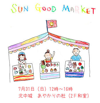 管理人様 貴重なスペースを拝借して 夏休み親子向け小さなマーケットのご案内させていただきます。 ・・・・ 「SUN GOOD MARKET」 7月31日(日)12時〜16時 北中城村 あやかりの杜(2F和室) ママもお子さんも一楽しめるマーケットです。 ナチュラルなおもちゃに体に優しい食品、素敵な文房具に、 かわいいTシャツ、おいしいお菓子・・・。 暑さに負けそうなママ達、自然素材の気持ちいい雑貨や おいしい物に囲まれて、一息つきませんか? こだわりを持った素敵な商品ばかりです。 お子さんも楽しくなる商品もありますよ