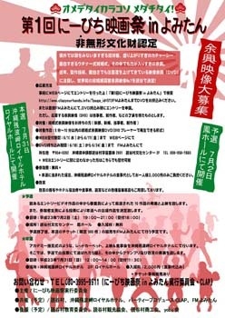 YOBU会&FMよみたんコラボイベント! 「第1回にーびち映画祭inよみたん」開催決定!! 余興映像大募集!! 県外では類をみない多すぎる招待客、盛り上がりすぎのカチャーシー、 面白すぎるウチナー式結婚式。その中でも力が入りすぎの余興。 近年、製作技術、面白さでも注目度を上げてきている映像余興 (DVD)に注目し、世界初の結婚披露宴余興映像?1を読谷で決定! 詳細はこちらから! http://www.clapyourhands.info/?page_id=57 予選 数あるエントリービデオ作品の中から