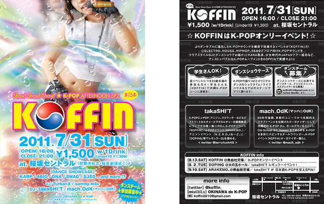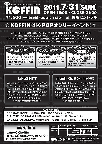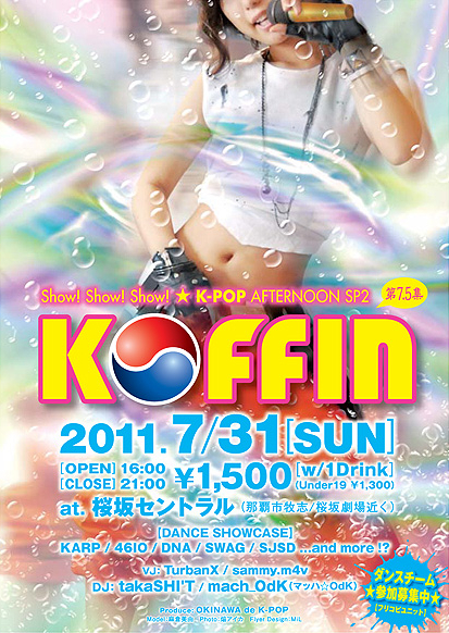 お待たせ! K-POPオンリーイベント『KOFFIN』昼イベ第2弾です! カバーダンスユニットまだまだ募集中!(オリジナルでもOK!) ──────────── Show! Show! Show! ☆ K-POP AFTERNOON SP2 KOFFIN 第7.5集 2011.7/31[SUN] OPEN 16:00 / CLOSE 21:00 一般¥1,500 / 未成年¥1,300 [w/ 1Drink] at. 桜坂セントラル(那覇市牧志/桜坂劇場近く) DANCE SHOWCASE: KARP / 46IO / DNA / SWAG / SJSD and more... VJ:TurbanX / sammy.m4v DJ:takaSHI'T / mach_OdK ──────────── 【KOFFIN は K-PO