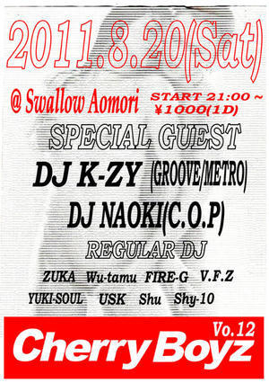 2010/08/20 cherryboyz@swallowaomori 21:00open!! 1000yen1D!! GUESTDJs k-zy(GROOVE) NAOKI(c.o.p.d) and cherryboyzCrew Swallowaomori HIPHOP.R&Bの人気Party!! さわげ〜夏はまだまだ始まったばかり!!