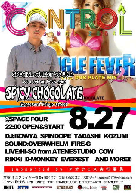 毎月第四土曜開催!CONTROL! 今月は、大HITレゲエコンピレーションCD「東京RAGGA BLAZE」「東京RAGGA LOVERS」をプレゼンツ、また東京の夏のビッグイベントの定番となった「渋谷レゲエ祭」を主催するなど、間違いなく東京を代表するBIGサウンド【SPICY CHOCOLATE!KATSUYUKI a.k.a.CONTROLER!】が登場!!!!!!!!!!! 『君に会いたい...feat.青山テルマ&RYO the SKY WALKER』や、ENT DEAL LEAGUE(MICKY RICH、KEN-U、DOMINO KAT)、CHEHON、BIGGA RAIJI、NATURAL WEAPONらを収録した『JUNGLE FEVER 2』も話題沸騰中! YOUTUBE SPICYCHOCOLATE TV→