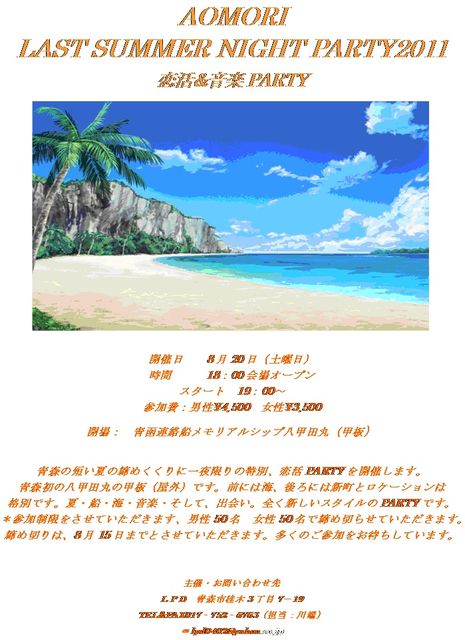 青森の短い夏の締めくくりに一夜限りの特別、恋活&音楽PARTYを開催します 青森初の八甲田丸の甲板(屋外)です 前には海、後ろには新町とロケーションは格別です 夏船海音楽 そして、出会い まったく新しいスタイルのPARTYです *参加制限をさせていただきます、男性50名 女性50名で締め切らせていただきます。 彼氏・彼女いない方、友人・知人・付き添いの方、参加可能です 締め切りは、8月15日までとさせていただきます。多くの