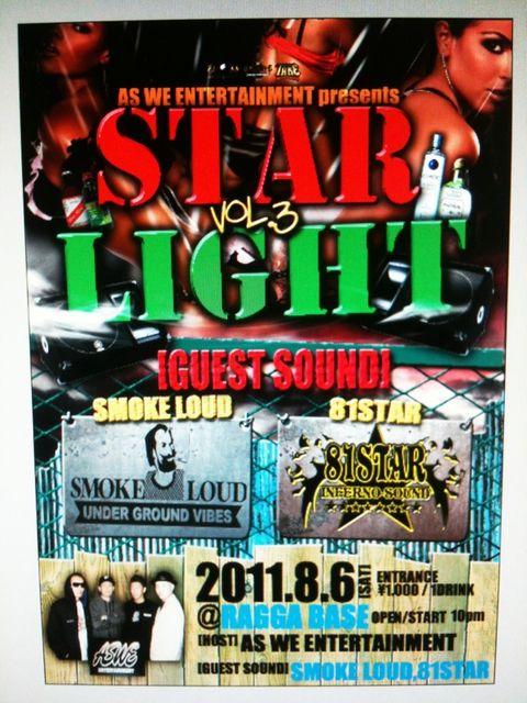 今回の【STAR LIGHT】は場所をラガベースに移してのDANCEになります。 遊びに来てくれた方にはAS WEのステッカーをプレゼント! ☆AS WE ENTERTAINMENT presents☆ 【STAR LIGHT vol.3】 2011/8/6(SAT)@RAGGABASE ・ENTRANCE ¥1000(1D) ・OPEN_START 10pm <GUEST SOUND> ・SMOKE LOUD fr.Hachinohe city ・81STAR fr.Misawa city <HOST> ・AS WE ENTERTAINMENT 【AS WE ENTERTAINMENT】 ・メンバーはSKYHOOK fr.RAGGABASE、SATO-C fr.FLOSS THE MOVEMENT、TAKE fr.OCEAN SOUND、SHIGE fr.自然防衛軍、HARU fr.81ST
