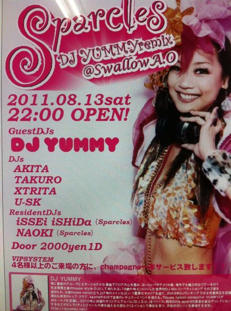 2011.08.13 Sparcles-DJYUMMYREMIX-@swallowaomori GUESTDJ YUMMY DJ AKITA(FUllhouse) XTRITA(XTR) TAKURO(Multiply/Fullhouse) USK(cherryboyz) RESIDENT iSSEi&nAoki 2000yen1D VIPSYSTEM 4名様以上の来場の方champagne一本サービス!! 今回はSparcles夏休み超超超〜特大号!! 都内より、日本でも実力派No1フィメールDJの呼声も高いDJYUMMYが登場!! 先日も世界的スーパースター!!スペースカウボーイとの共演も果たし、clubシーン大注目のDJがSwallow初登場!!! 青森DJsも、過去guest陣が大集結!! 若手