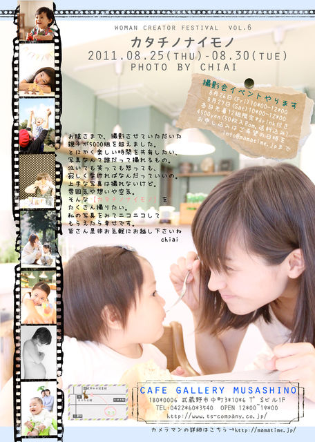 2011*8.25-30まで武蔵野市の【cafe gallery musashino】さんにて 写真展を開催させて頂く事になりました☆ 詳しくはこちら↓ http://mixi.jp/view_bbs.pl?id=63559473&comm_id=3103012 2日間のみ【撮影会】を開催させて頂ける事になりました! 各日、先着18組のみの募集になります。 ↑ 27日(土)12*00〜の枠を追加しました! お飲物やサンドイッチ、シフォン、ロールケーキなども ご用意して頂ける事になっています。 (撮影会には親子ワンドリンク(ママ1子供1分)サービスです) *お飲物400円〜 *ロールケーキ×ドリ
