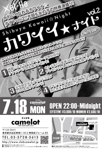 告知失礼致します。 管理者様、内容が不適切でしたらお手数ですがご指摘、削除お願いします。 7月18日(月曜)の渋谷camelotのPARTY情報です 『女の子は常に可愛くいたい もっともっと可愛くなりたい』 そんなあなたに取って置きのイベントを開催します 渋谷発信のカワイクなれちゃうオシャレ新感覚イベント 人気美容室の無料ヘアブースが登場 スペシャルプレゼントをご用意 女性来場者全員にshu uemuraのアイラッシュ 抽選で綺麗になれちゃうスパラクーア無料招