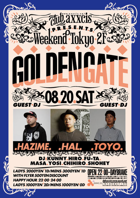 管理人様告知失礼します。 ■8/27(Sat.) GoldenGate@axxcis open/22:00〜 GUEST: ・DJ HASEBE ・DJ WATARAI ・DJ KEN-SKE 毎週末1000人規模のPartyが繰り広げられるclub axxcis! 毎週土曜日の"GoldenGate"はaxxcisの看板パーティー!週替わりで日本を代表するDJがGuest出演し超満員のフロアを揺らしてます! 8/27のGoldenGateには、ZeebraやSUGARSOUL、倖田來未から、SPEECHやDOUG E FRESH等の楽曲を手掛けるもはや"世界の"『DJ HASEBE』、そして同じくトラックメイカーとしてHipHopアーティストはもちろんMISIAや安室