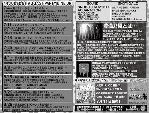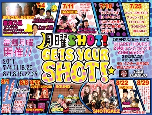 告知失礼します。 ※大阪月曜レゲエのこれぞパーティスタイル! ”月曜SHOT!”〜GETS YOUR SHOT!〜 心斎橋サム2で朝の6時まで絶賛上げ上げ中! 踊り好き&飲み好きともに盛り上がってます! いよいよ夏本番!遊ばな損!来なきゃ損! お財布にうれしい2時まで\500ポッキリ! ワンコイン入場のHAPPY HOURS断行! 遊び慣れたPARTY好きはお早め入場でお得に! これだけではございませんよ〜 恒例ドリンクのディスカウントTIMEあり! BARカウンター大混雑!のなか 週替わりのコンテンツをご用意! 7月.8月も毎週替わりの企