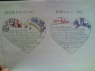 0628〜0708まで 2代目JSB vs 3代目JSB 〜EXILE TRIBE〜が行われます! これを記念して将吉とネスミスに おそろいの2代目JSBメモリーアルバムを プレゼントしようと思います♪ 企画者は‥ #12しーやん∞と( asm *゚ )です ★企画?:将吉ネスにファンから愛を込めて‥ ((メッセージカードについて)) *サイズ* 縦7cm×横10cmの紙 (ネス吉用2枚!) *かたち* 上記サイズの紙いっぱいに ハートを書き、切り抜いた物を2枚 [写真]※最後に添付 *色* 白と薄いピンクの2色 (色の指定はメッセします) *