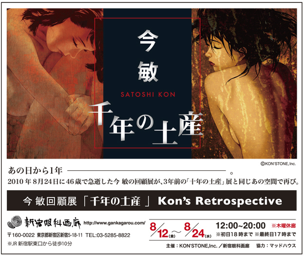 本日、公式サイトにて、今監督の回顧展が開かれるとの告知がありましたので、 僭越ながらトピたてさせていただきました。 楽しみというには複雑な心境ですが、また監督に触れることのできる機会ですね。 以下、公式サイトより転載です。 Kon's Retrospective 千年の土産 今 敏 回顧展 あの日から1年――。 2010年8月24日に46歳で急逝した 今 敏 の回顧展が、3年前の「十年の土産」展と同じあの空間で再び。 会期 2011年8月12日(金)〜24日(水) 12:00〜20:00 * 8月18日(木)は休廊です * 初日(8月12日)は18:00まで、最終日