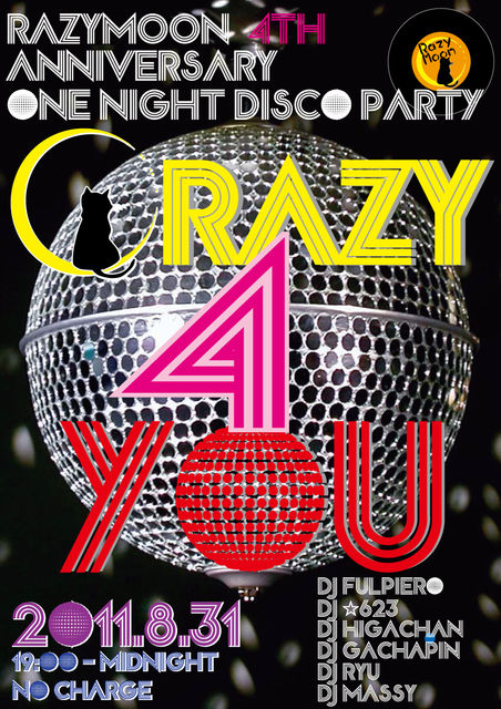 ぴかぴか(新しい)RAZYMOON 4TH ANNIVERSARYぴかぴか(新しい) 夜ONE NIGHT DISCO PARTY夜 ムード【CRAZY 4 YOU】ムード 日本語字幕(和訳:戸田奈津子) レイジームーン開店4周年記念・一夜限り熱狂乱舞の宴 「おまえにゾッコンさっハート」 まだまだ残暑厳しい日々ではございますが皆様如何お過ごしでしょうか? 2011年の夏は楽しめましたか?それとも…? そんな夏のしめくくりに、素敵なPARTYを開催しちゃいますのでお知らせいたしますexclamation ×2 何と我等の秘密基地RAZYMOONが、めでたく4周年を迎えることになりましたバースデー 「これもひとえに
