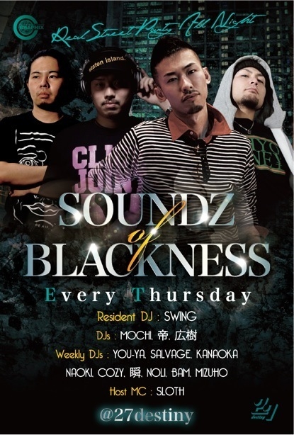 管理人様、告知失礼します! Every Thursday Night Hip Hop Party 8/4(木)"SOUNDZ OF BLACKNESS" @ 27 destiny この間違いPARTYに遊び来たい方は↓↓↓ __________________________________________________ ☆ゲスト料金☆ 男女1000/2d その際、代表者(ニックネーム可)と大体の人数を添えてご連絡いただけたらスムーズにゲストとれます。 もし、メッセージがめんどうな方、いきなり行きたくなった人は、 27destinyのエントランスにて、 ★「モチのゲストでブラック」★ と言っていただければ何人でも同じディスカウント