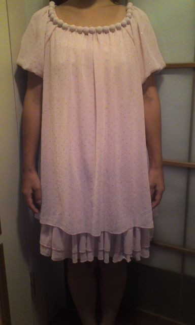 いつもお世話になります 今回は、友達の結婚披露宴に着ていく洋服についてご意見を【ください】 画像のワンピースは披露宴にどうですか? 薄いピンク色で全体的に細かいラメがついてます。 丈は膝が隠れるくらいです。 私にとってはかなりのおしゃれ着なんですが…一般的には普段着レベルなのかもしれません。 披露宴ですし、ドレスがいいのかな?とも思いますが通販などを見ても二次会用ドレスみたいなのばかり出てきます。(結婚式やパーティーやフォーマルで検索しました) そして、32歳の私が着ていくにはちょっと…と思うようなデ