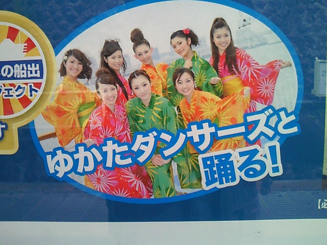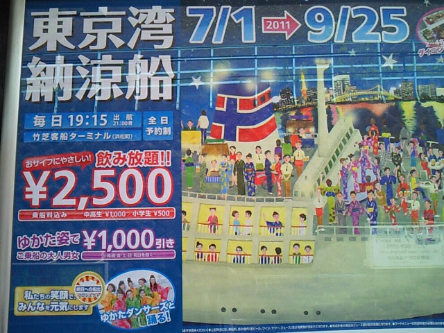 え゛ー 猛暑から 急激な気温低下と 天候不良が続きますが ご健勝であらせますでしょうか? 先般より 度々書き込んでおりました。「浴衣納涼船」 隊長より「出航はいつだね」と 督促が(^_^; ございまして 企画させていただきました。m( _ _ )m (多少誇張的 嘘もございます。) 浴衣で来ると 1000円引きという まことに天晴れな企画ですから 是非ご参加くだしゃんせっと。 集合は 出航1時間くらい前に 浜松町では いかがでせうか? また 待ち合わせ時間は 調整できます。 予約制なので よろしくお願いします。m( _ _