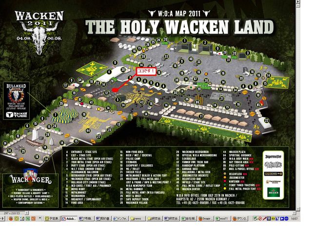 さあ今年の開催まであと1ヶ月を切りました! ということで、恒例のWACKENで会いましょう!2011を開催したいと思います! 例年夜遅くてわかりづらいため、今年は日中の開場時に行いたいと思います! 8/5(金曜)11時〜 8/6(土曜)11時〜(予備) 場所はBEER GARDEN前(地図12番の前) で旭日旗(日本海軍や朝日新聞でみかけるあれ)もってお待ちしております! 遠い異国までメタルを観に来る同士を称えあいましょう! ※以下更新 金曜雨予報になってます。土砂降りの場合は土曜に延期しますのでお願いします!