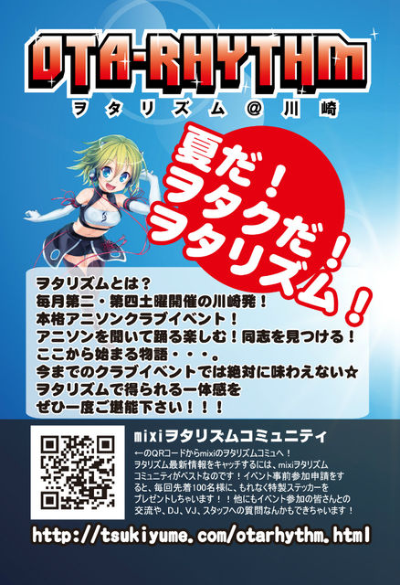 ヲタリズムver3.17+@川崎 club 月あかり夢てらす ■■■お知らせ■■■ ・参加表明特典のステッカーが新しくなりました! ・最近持ち込み(ドリンク等)が多々見受けられます。ダメぜったい! ・入場をスムーズに行う為、参加表明した際のコメントを携帯にて掲示して頂きます。 ■■■東北関東大震災被害に対する支援活動■■■ ・イベント会場に義援金の募金箱を設置いたします。 ・チャリティーTシャツを販売しております。(収益は全て義援金として寄付いたします) ■詳細サイト参照 http://miima.co.jp/info_osirase/ ■■■開催
