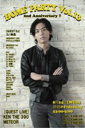 管理人様告知失礼します 偶数月第4水曜日大盛況イベント!!! 毎回豪華なゲストを迎えて開催しているHOME PARTY!!! 今回ゲストにDJ珍念、KEN THE 390、METEOR とかなり豪華になってますので是非遊びに来てみてください!!! ゲストご希望の方は、 代表者名と大体の人数をメッセージいただければ、 ゲスト料金にて入場できます また27detinyのエントランスにて 「DJコージのコージ」