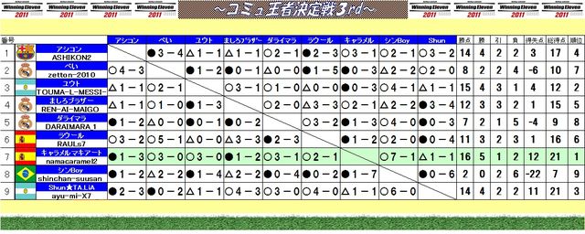 最初に!参加の際、ウイイレID(PS3アカウントのID)と使用チームの記載がない場合、 参加と見なしません。 相手にも迷惑がかかる為、全消化確実に消化出来る方のみご参加ください。 できそうもない方は、参加をご遠慮願います。 必ず最新版のパッチをアップデートした状態で 大会に臨んでください。 第11回大会〜第15回お中元カップ大会までの大会参加獲得ポイントの 上位11名限定による、コミュ王者決定戦3rd[PS3版]を開催致します コミュ最強をかけた戦い・・・今大会で、コミュランキングを決定します。 ※通常は上位10名