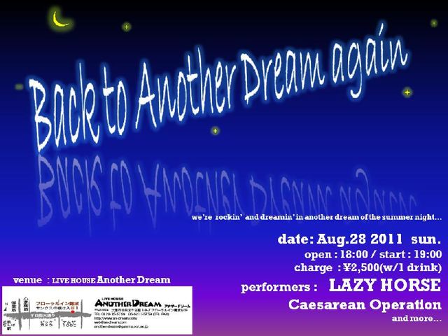 急きょ、ANOTHER DREAMでライヴします。 久々のアナザーです。 詳細、決まり次第アップします。 ■Back to Another Dream again■ 日時:2011年8月28日(日)18時開場、19時開演 会場:LIVE HOUSE アナザードリーム 料金:2,500円(1飲料付) 出演: LAZY HORSE Caesarean Operation The Saddle Bags(rumour) ふぁーまー・じょん デヴィル(噂) ほか