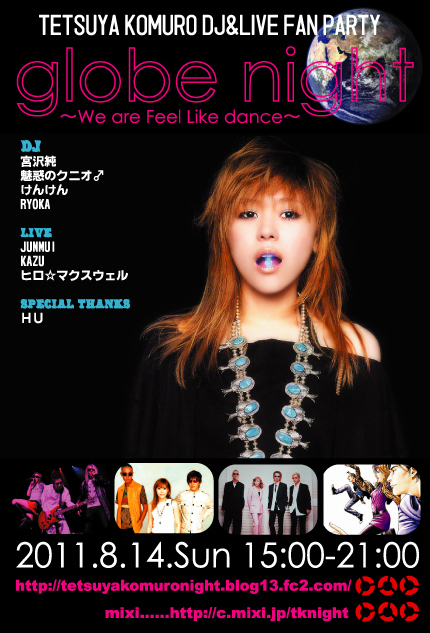 globe night〜We are Feel Like dance〜 8月がglobeが「Feel Like dance」でデビューした記念すべき月です! 今年の“globe night”は日曜の昼間開催となります☆ ご家庭があってオールナイトが厳しい方や未成年の方も、 今回は是非遊びに来てみて下さい! --------------------------------------------------------- 日時:2011年8月14日(日)15:00〜21:00 ※イベント終了後各自終電まで2次会あり! 場所:新宿URGA TEL:03-5887-3390 住所:新宿区歌舞伎町2-42-16第2