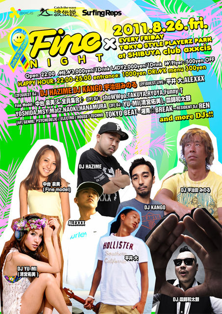 管理人様告知失礼します。 本日8/26(金)に「Fine」のクラブイベント「Fine Night」が渋谷axxcisにて開催されます。 今回は毎週金曜日渋谷axxcisにて開催されている800人規模のBIG PARTY「TOKYO STYLE」とコラボレーション! GUEST DJは2Fには宇治田みのる,DJ HAZIME,DJ KANGO 3FにはDJ YU-MI[清宮佑美],DJ TATSU,DJ SHEIKERを迎えます。 FINEモデルの出演もあり一層の盛り上がりを見せること間違いなしです!!! エントランスにてタケのゲストで「ケイ」と言って頂ければ何名でもゲスト料金でご入場できますのでご利用ください♪
