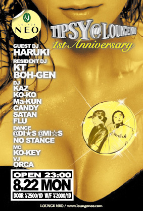 8月22日、月曜日! 渋谷 Lounge NEO (VUENOS 5F)で各月第四月曜日に開催の大好評パーティー 「TIPSY」の一周年PARTYが開催されます 毎回300人近く動員する大人気PARTYです!! 今回はGUEST DJにR&B好きならだれもが知る Mr. APPLE PIE [DJ HARUKI]!! 楽しく酔っ払おうをコンセプトにHAPPYな空間を作ってきたTIPSY、今回も最高の空間が作り出されるでしょう!! 今回は先着50名様にTIPSY 限定MIX CDをプレゼント!! ゲスト入場方法です!! 通常2500円かかってしまうところ、 メッセージ頂ければ、1500円1ドリ