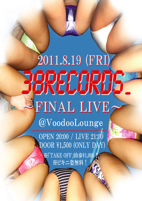 8.19は、38RECORDSのファイナルライブ!!! 行かないと絶対後悔する!>< 2011.8.19(FRI) 『HI-JACKASS』 〜38RECORDS FINAL LIVE〜 @VoodooLounge OPEN 20:00 / LIVE 21:00 DAY \1,500+1D CAST : 38RECORDS ※『TAKE OFF』を持参の方は\1,000 +1D ※ビキニ姿で来場の方は入場無料 ※当日のみとなります 問合せ : info@38records.jp