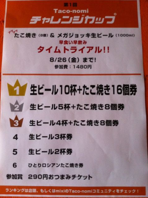 皆様こんにちは店長のたかしです突然ですが、8月10日から第1回Taco-nomiチャレンジカップ開催しちゃいました ルールは至って簡単アツアツタコ焼き8個&MEGA-Tacoジョッキ(1000ml)の早食い早飲みにチャレンジしていただいて商品をGETしましょうという企画でございますチャレンジお待ちしてます ランキングは店頭、コミュニティで毎日更新していくのでお見逃しなく