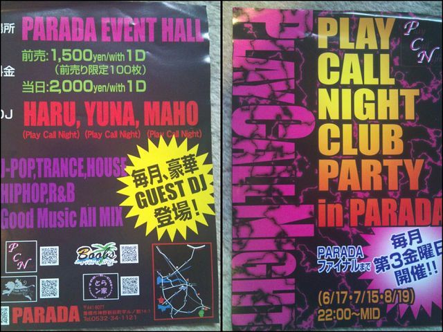 みなさんこんにちわ いや・・・ もりーすっ あの豊橋を代表するクラブハウス「PARADA」が今月で終わりになります 僕は悲しいです でも最後にぱーっとPARADAで盛り上がりましょうよ!! このイベントはHAPPINESS主催ではありませんがこの場所でも参加を受付します 主催は豊橋を代表する ブーブス豊橋 http://mixi.jp/view_community.pl?id=3273875 そして PLAY CALL NIGHT http://mixi.jp/view_community.pl?id=5366713 クラブハウス PARADA http://mixi.jp/view_event.pl?id=640998