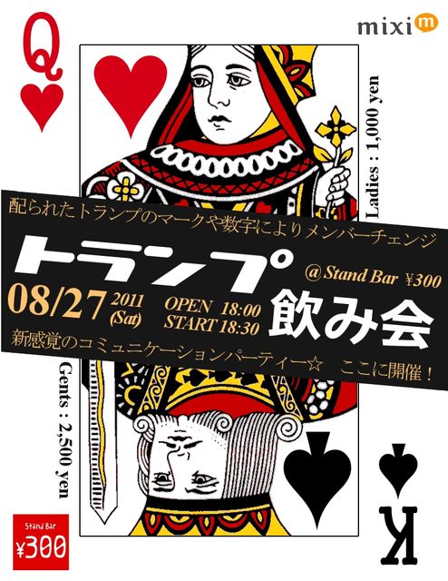 トランプの色・マーク・数字によって、話す相手をチェンジする新感覚のコミュニケーションパーティーを開催します 詳しくはこちらの日記で↓ http://mixi.jp/view_diary.pl?id=1758538251&owner_id=7670115 この飲み会では始めに配られたトランプを使い、できるだけ多くの友達ができるよう私がみなさんを誘導しグループを作っていきます 自由すぎてどこに行けばいいかわからず、結局すみのほうで1人ポツンとしてた なんて事がないように、少人数のグループで話しやすい環境を作るので安心して参加