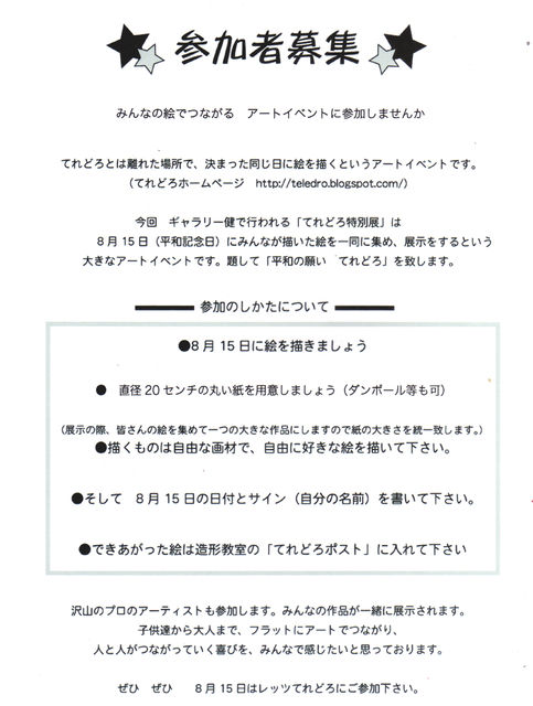 夏のてれどろの契約書類を無事ギャラリーに提出致しました。 毎年、ギャラリー健でも「てれどろ」作品を集めて頂いておりますので 参加募集のチラシも出来ました。 てれどろ2011「○」 (+作家達展ブース) 場所 ギャラリー健(主宰)http://galleryken.com/ 産経新聞社(後援) 22日(お昼12時から搬入、夕方位まで) 23日(展示開始日) 28日(展示最終日 午後5時から搬出) 参加表明作家の方々(こちらは募集〆切っております) 一人3,500円 (DM、広告、ワークショップ備品) 作家展ブース(一人あたり幅80cmか