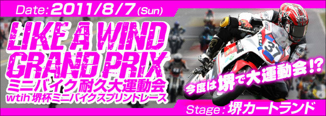 ST/SP ■堺杯スプリント OPEN 10周 (定員各25台) 超OPEN ■Like a windGP ビギナー 60分 1チーム4名 (定員35台)ツナギ不要! 耐久運動会 中・上級 120分 1チーム4名 (定員35台) 詳細はLike a windホームページで☆ http://www.likeawind.jp/special/gp/