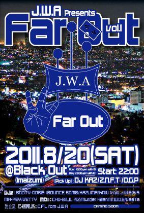 九州Westcoastシーンの歴史に新たなページが刻まれた昨年の10月10日... 忍 a.k.a San Quentoを中心に結成されたJ.W.Aが遂に動き出す!! J.W.A presents [Far Out Vol.01] Adv: \1,500w1D Day: \2,000w1D [Pick Up] DJ KAZ Z.N.F.T O.G.P DJs: BOOTY-GORIS BOUNCE BOMB KAZUMA KOW from J.W.A K’S MA-KEY VETTY MCs: CHO-B LIL KIZ' from J.W.A Murder Killer Mr.W.O.B VasTa from J.W.A 我全流 C-WALK: C.F.L fom J.W.A 〜要チェック〜 ・出演DJはWESTCOASTに偏らずNYからビルボードまで幅広く全てのHipH