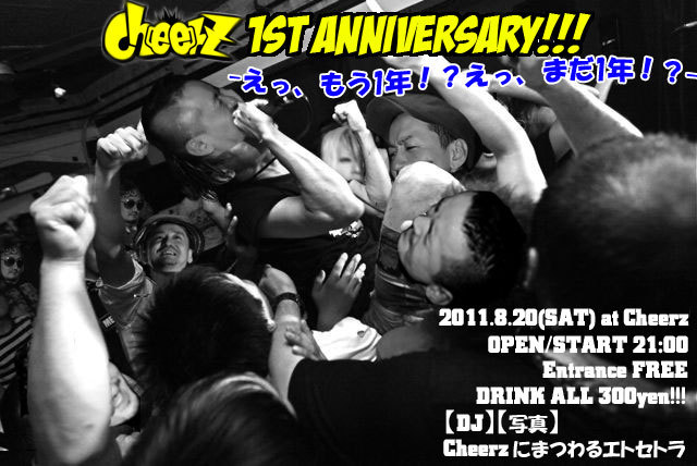 なんとCheerz、8月20日に早くも一周年を迎えます! こうして一周年を迎えられるのもひとえに皆様のおかげです!! 本当にありがとうございます!!! 感謝の気持ちを込めて、この日はDRINK ALL 300yenでイッちゃいます! 是非お気軽にお立ち寄り下さい〜♪