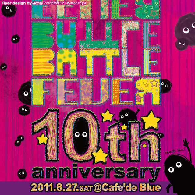 「ありがとうございます!」 皆様のおかげでBATTLE FEVERは10周年を迎えることができました! 10年前、高知にROCKのDJイベントはほとんどなく、ROCKで踊ることに飢えてたあの頃。「だったら、自分たちでやるか!」と思ったのがBATTLE FEVERを始めたキッカケでした。 そしてCafe'de Blueに出会い、良いメンバーに出会い、沢山のお客さんの笑顔に出会えた10年でした。 一つの節目となる今回は、この10年の間にレギュラー参加し、フロアを盛り上げてくれた愛すべきバトル・メンバーたちに出演してもらいます! このメンバーが揃うのは今回が最初で最