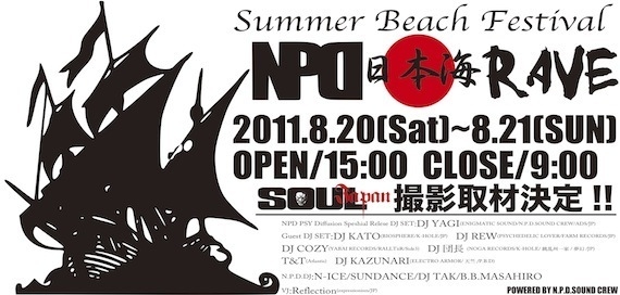 8月20(sat)〜8月21日(sun)☆NPD 日本海 RAVE 2011☆ SOUL JAPAN撮影あり! あの... N.P.D. SOUND CREW主催の 日本海 RAVE が2年振りに復活 日本一の夕日と 佐渡島が一望できる内野浜 に 日本のトップアーティストが大集結☆ キャンピングカー、 キャンプ道具、テント持ち込み勿論OK!! BBQもOKです!! 今年の夏 日本海の大自然とサイケデリックトランスで遊んじゃおう !! Summer Beach Festival NPD 日本海 RAVE 8月20(sat)15時〜8月21日(sun)朝9時 場所 新潟県・内野浜海水浴場 海の家