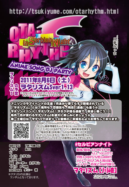 ヲタリズムS ver1.13 @川崎セルビアンナイト ■■■お知らせ■■■ ・開催場所は川崎セルビアンナイトとなります。 ・参加表明特典ステッカーNewバージョン! ■■■開催日■■■ 2011年08月06日 土曜日 ■■■開催時間■■■ 開場 22:00 開演 23:00 ■■■入場料■■■ 男性2,500 女性2,000 ※各1ドリンクサービス付 ※再入場可能(コスプレを着たままの外出はご遠慮ください) ■■■特典1■■■ 当トピックにて参加表明して頂けた方は!!! ★入場料500円割引★ フライヤー持参の方も!!! ★入場料500円
