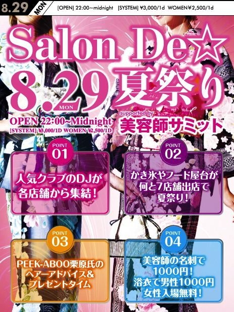 早急に入られたい方メッセージが苦手な方 入り口で五十嵐ゲストのイヤラシと言ってもディスカウント対応可能です 8-29 (月) Salon De☆夏祭り 渋谷キャメロットにて毎回500人 お洒落ボーイ、お洒落ガール率NO.1イベントです 今回は夏祭りSP 都内有名美容室スタイリスト多数出演 日本最大規模の美容師ナイト 美容師,アパレルの客層でにぎわうパーティーです 都内有名店舗で活躍する人気スタイリストがDJを担当 かき氷やフード