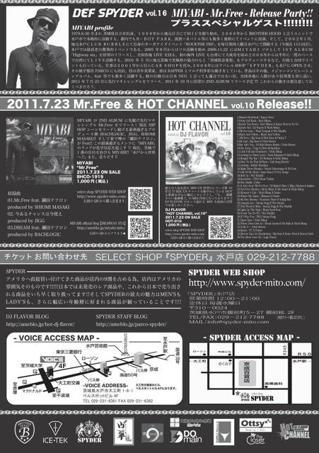 管理人様、告知失礼致します。 ★★★DEF SPYDER vol.16★★★ 〜MIYABI 「Mr Free」リリースパーティー!!!〜 MIYABIが2ND ALBUMに先駆け 先行マキシシングルMr.Freeをリリース!!! 現在HIP HOPシーンをリードし続ける豪快過ぎる プロデュース陣(BACHLOGIC、JIGG、SHIOMI MASAKI)!! そして、巷で噂の「鋼田テフロン」がFeat!! この最強過ぎるメンツに「MIYABI」のラップが化学反応を起こす!! 現在、茨城で1番の注目を浴びるMIYABI!! 「水戸から世界へ!!」また、走りだす!! Mr.Free feat. 鋼田テフロン