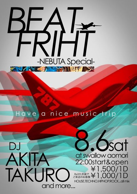 NEWPARTY BEATFRIHT@SwallowAomori 1000yen1D!! ねぶた衣装でご来場の方は、 DJAKITA,TAKUROによる、 イエガーマイスタープレゼント!! DJ AKITA(Fullhouse/Sparcles) TAKURO(Multiply/Fullhouse) andmore!! 管理人様告知スペースありがとうございました。 SwallowAomoriPartyプロデューサー 対馬健