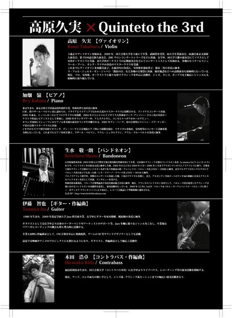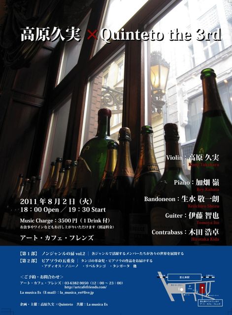 来る8月2日(火)に恵比寿にてライブがあります 前回のライブは3月末に同じ会場で行われ、震災後にも関わらず 多数のお客様にご来場頂き、メンバー一同、心より感謝しております。 今回、3度目にして完全自主公演となります 前回と同様、第1部はメンバーの得意分野披露、 第2部はタンゴの革命児、アストル・ピアソラの作品をお届け致します 以下、詳細になります 「高原久実×Quinteto」the 3rd <日時> 8月2日(火)19:30より(18時開場) <料金> 3500円(1ドリン